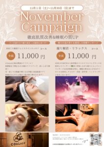 11月のヘッドスパのキャンペーンは新発売のSINNPRETE夢守りの香り使用。 香りのコンセプトは、深いまどろみと静寂を保つ、夢守り。柔らかな泡が夜の静寂にじわじわと溶け込むように広がり、心を静かに整え、現実と夢の狭間のまどろみの世界へ誘います。 気候も変わり肌や睡眠ストレス、そして目に見えない疲労が出てくるこの季節しっかり自分と向き合う時間を大切にメンテナンスしましょう。
